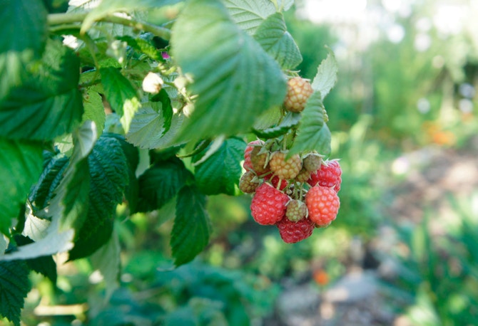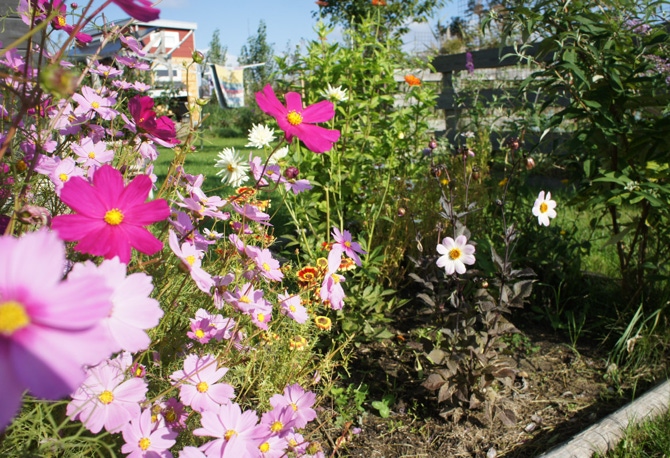 We hebben onze tuin ingedeeld in verschillende groene onderdelen met elk een eigen taak en karakter. De hoek met de moestuin is uitgebreid met een bloemenpluktuin, waar naast door ons gekweekte bloemen ook dahlia’s zijn geplant. Op meer plekken op het terrein hebben dahlia’s een plekje gekregen, ze zorgen voor veel kleuren en hebben prachtige diverse vormen. Tegenover de kas is een fruitpluktuin gerealiseerd. Hierin staan frambozen, zwarte bessen en aardbeien rondom twee loquatboompjes, die helaas dit jaar nog geen vrucht hebben gegeven. Hopelijk zijn ze volgend jaar goed genoeg geaard om hun bijdrage te kunnen leveren. In de borders rond het deelerf en de parkeerplaats zijn dit jaar verschillende inheemse planten aangeplant. Egelantierstruikjes hebben een plekje gekregen tussen kornoelje en sleedoorn en het dak van de deelschuur is voorzien van een sedumlaag. Uit de vermeerdering van planten die al op ons terrein groeien zijn borders gevuld met margrieten, moerasbloem en duizendschoon. Rond het helofietenfilter van het deelerf bloeit nu munt en hemelsleutel tussen gestekte vlinderstruiken en lavatera. De planten hebben dit jaar hun plekje ingenomen en mogen volgend voorjaar de ruimte krijgen om nog groter te worden. In deze “inheemse” borders hebben bloeiende (on)kruiden dit jaar de kans gekregen om te groeien en te bloeien. Soms moet hier toch wat van worden gewied om te zorgen dat nieuwe aanplant goed aanslaat, maar het resultaat ziet er erg natuurlijk uit.