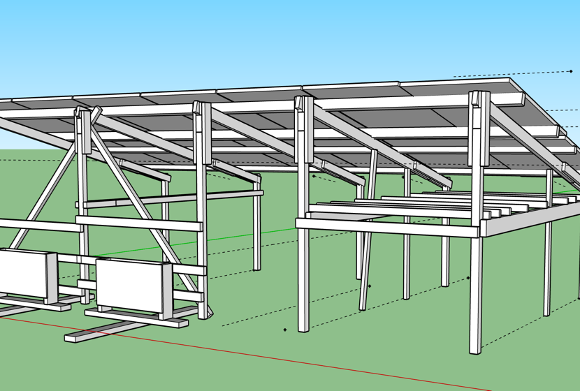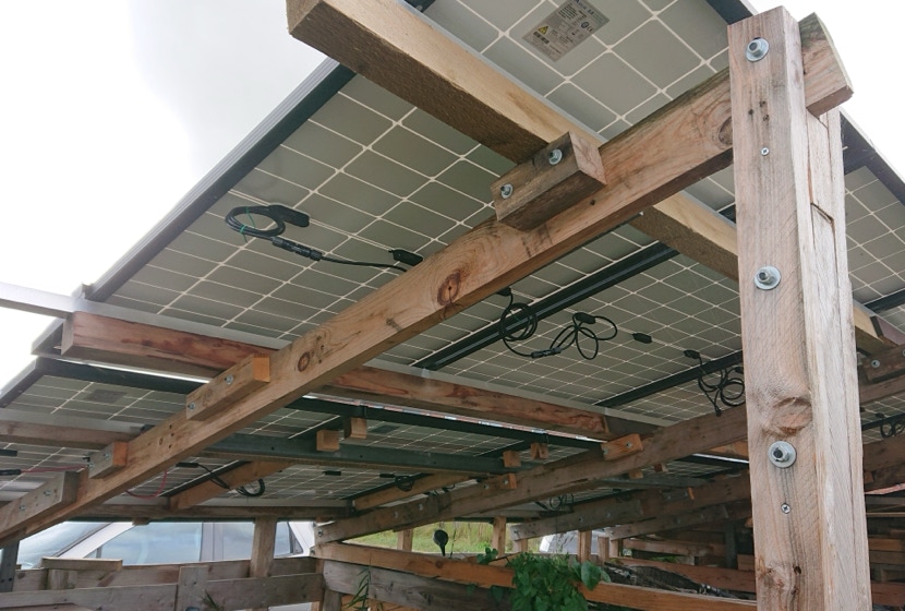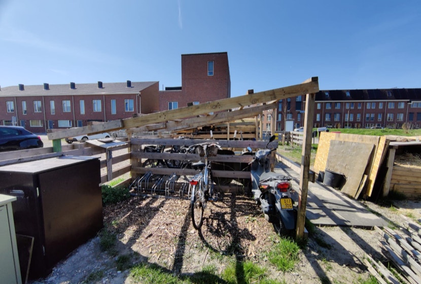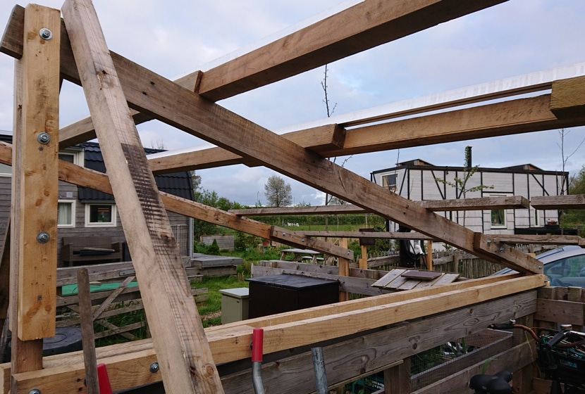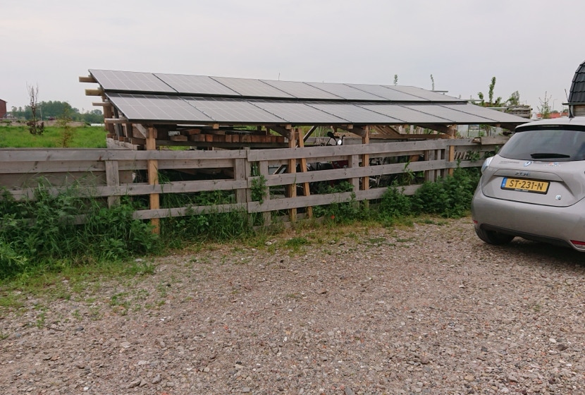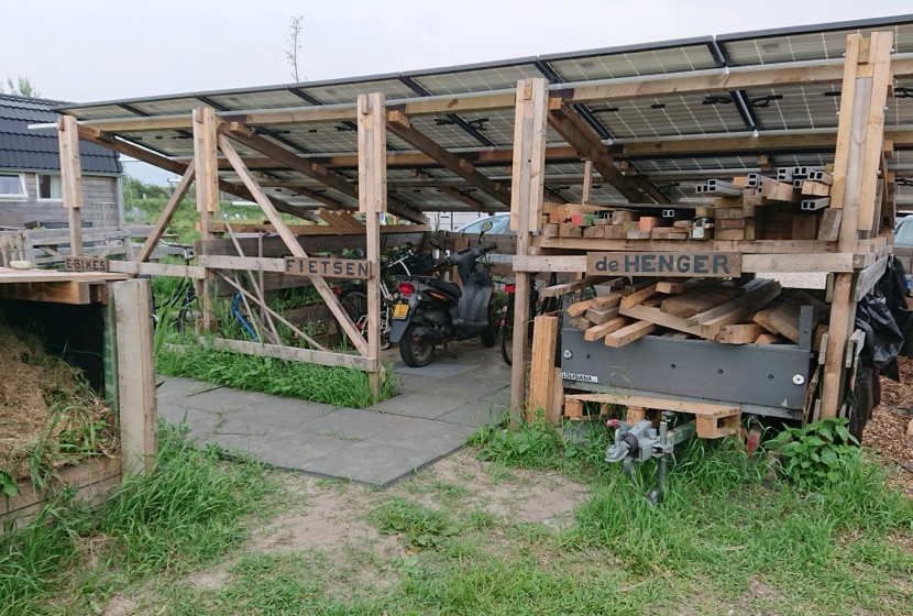 Maar omdat een snellader al gauw minstens 11kWh per uur nodig heeft kwamen we daarvan toch nog wat eigen opwek te kort. Omdat er op ons terrein een vaste plek was waar bewoners en bezoekers gezamenlijk hun fietsen plaatsten en we deze al een tijd graag wilden overdekken kwamen we tot de conclusie dat dit een geschikte plek voor extra zonnepanelen zou zijn. Van dikke pallet balken maakten we een stevig frame met zonnepanelen als dak. Goed tijdens zonnige dagen voor zo’n 4.5 kWh per uur extra capaciteit aan zonne energie. In eerste instantie leveren deze zonnepanelen extra energie aan onze huisjes als dat nodig is, wat over is gaat terug naar het net, en kan dus ook naar de EV oplader.