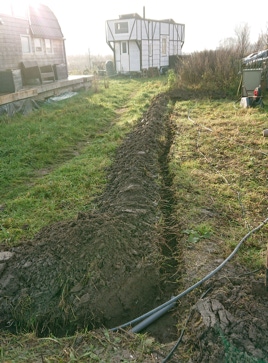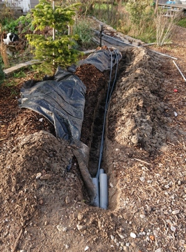 Hierdoor hoefde er dus maar 1 lange YMvKas DCA 4 x 6 grondkabel vanaf het hoofd stroompunt richting de picknickplaats te komen. Om een veilige aansluiting te kunnen garanderen was het van belang om ook de aardingskabel uit te breiden. Sommige van onze tiny houses hadden i.v.m. hun elektriciteits installatie zelf al een aardpen laten installeren, en sommige bewoners vroegen zich ook af of dit nodig zou zijn, vandaar dat we dit volgens de norm wilden uitvoeren.