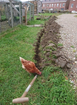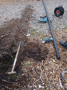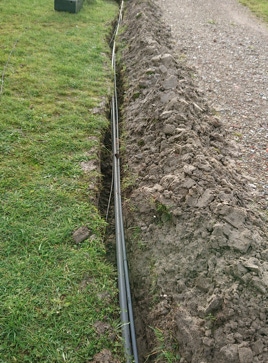 Nu konden de handen letterlijk uit de mouwen. De elektricien paste de hoofdstroomkast aan en zelf zorgden we er voor dat de kabels op een veilige diepte in de grond gelegd konden worden. Dit vereiste behoorlijk wat graafwerk op de van te voren strategisch bedachte route. Vooral om door de hoofdweg te komen moest er flink gebikkeld worden. Nadat de kabels in slagvaste buizen op de juiste plek lagen konden de goten weer worden dichtgemaakt.