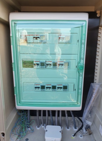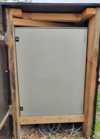 Op de centrale picknickplaats en naast het hoofdstroompunt zouden de extra verdeelkasten komen. We hadden gekozen voor 2 kunststof kasten en vonden het belangrijk dat hier een stevig beschermend frame omheen zou zitten, dit maakten we van houten pallet balken en 2e hands bouwplaten. Om het installeren van alle onderdelen in deze kasten makkelijk, veilig en overzichtelijk te maken zouden we dit in een montagekast bevestigen. De elektriciën regelde alle onderdelen en maakte een installatie schema. Hiermee konden we zelf deze onderdelen op de juiste plaats zetten en met elkaar verbinden. Nadat alle losse onderdelen waren voorbereid konden deze tot 1 geheel verbonden worden.